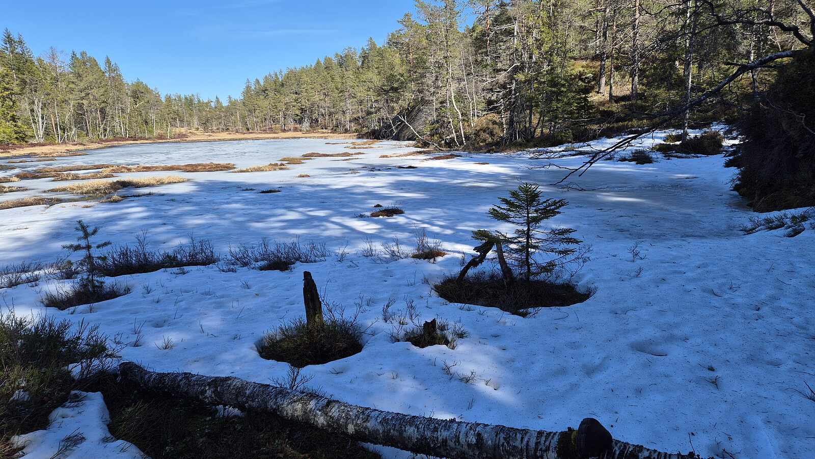 Men så ble det straks mer kronglete å ta seg fram ... Østover mot Vardefjell (587) ble jeg gående mer på tvers av rygger, dalsøkk og skrenter. Spesielt siden jeg ville gå over Mannbeinfjell (535). Skogen var for øvrig generelt grei å gå gjennom, bortsett fra litt høy lyng. Ellers var det mye furuskog og litt svaberg her og der, som jo er fint terreng å gå i. Men vått var det på de fleste myrer og søkk i terrenget. Veldig vått noen steder også. Og i enkelte nordvendte skråninger lå det igjen noen snørester.