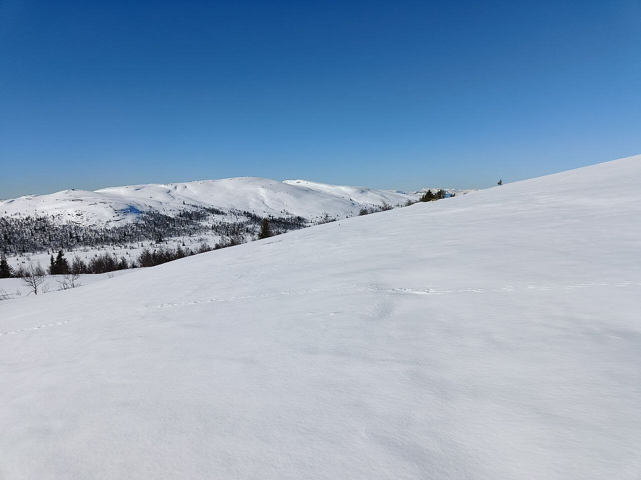 Perfekte forhold i dag, og bare å kose seg. Veldig greit opp til Kjølafjellet med superkorte feller under skia. Brukte vel en time opp, og var mye lettere i beina enn i går.