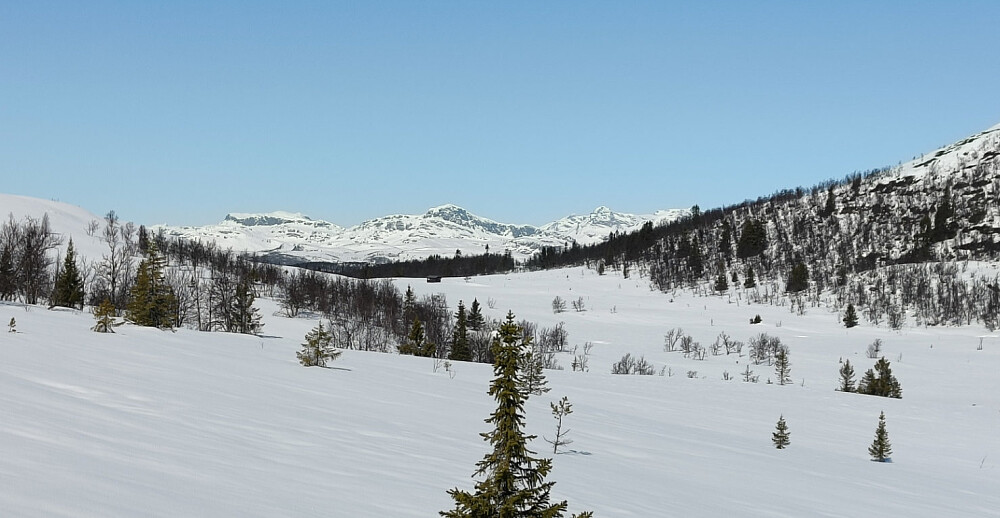 Ned mot Rauddalen i sør brukte jeg kartet på mobilen aktivt, for ikke å gå meg fast i bjørkekrattet. Det gikk strålende. Tok en god lunsj på en stein i sola nede på myra, hvor det fortsatt var ypperlige forhold, før jeg gikk opp på Gravfjellet. På veien opp fikk jeg et flott utsyn mot Bitihorn:
