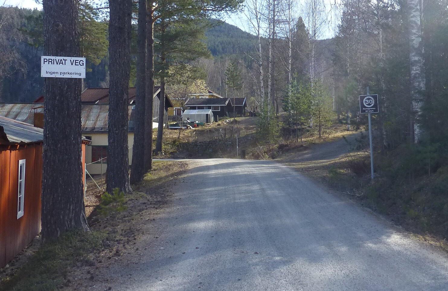Jeg kjørte til Tinnoset og parkerte på den store parkeringen som er tilrettelagt for besøk av Tinnosbanen. Ingen biler her i dag. Vegen inn var merket med privat veg to ganger og parkering forbudt to ganger, så greit å parkere her.