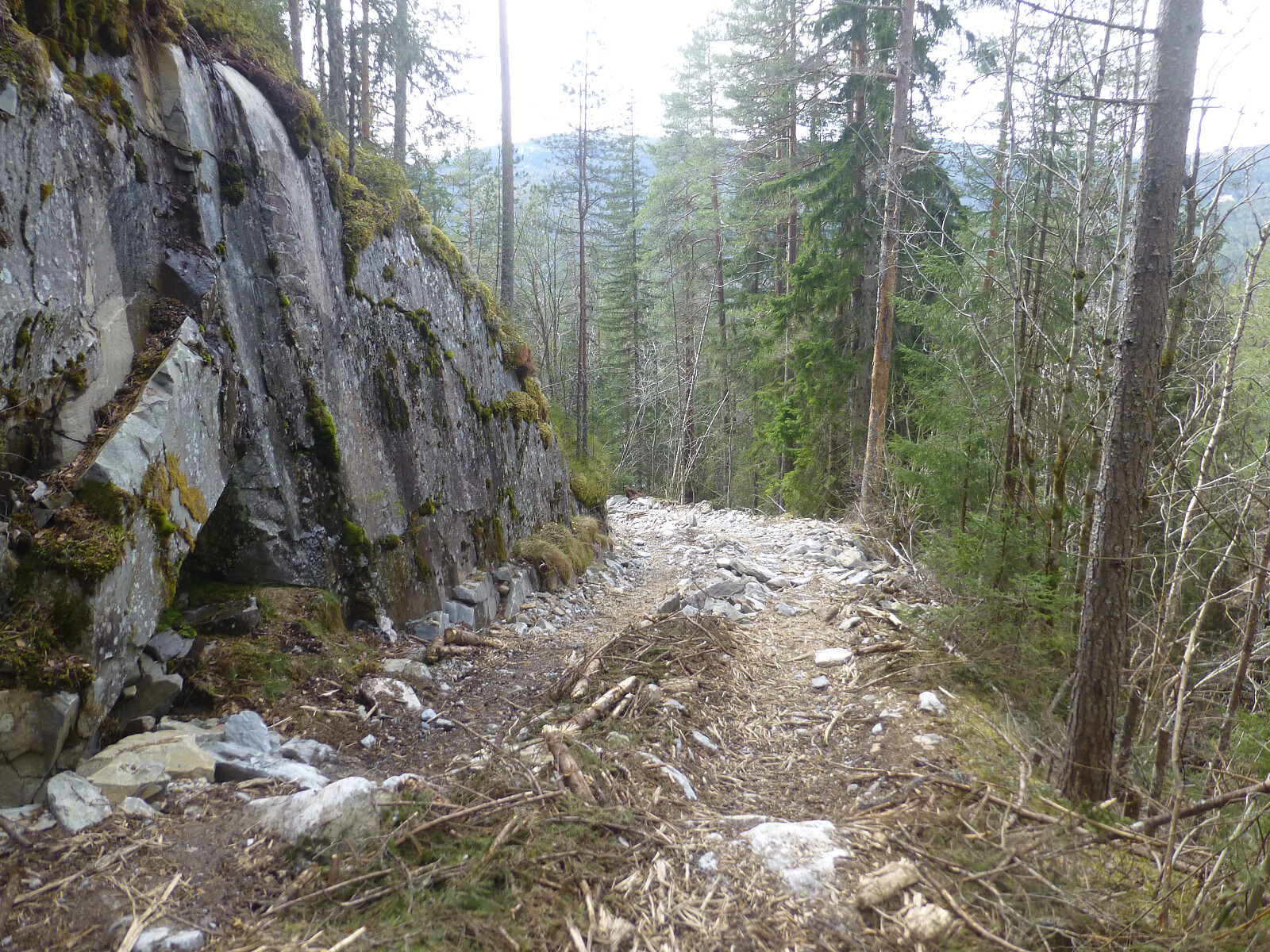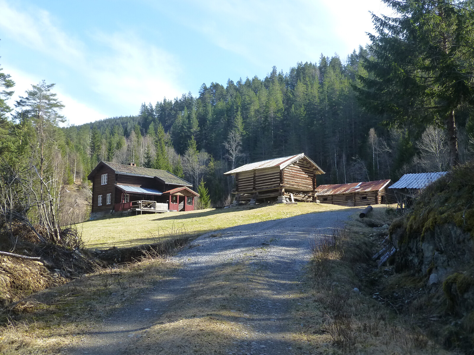 Jeg prøvde å følge dyrespor der jeg fant de, men de ville som oftest ikke min veg. Jeg kom ned til ei myr og derfra fant jeg traktorspor som førte meg helt ned til bebyggelsen. Fulgte en bekk som ble større og større nedover helt til den gikk utfor i en foss. Siste delen ned var det kjørt med skogsmaskiner og hele vegen var helt herpet.