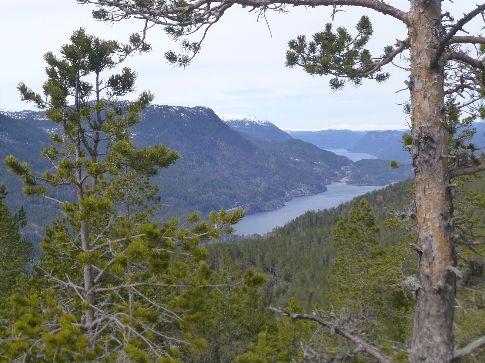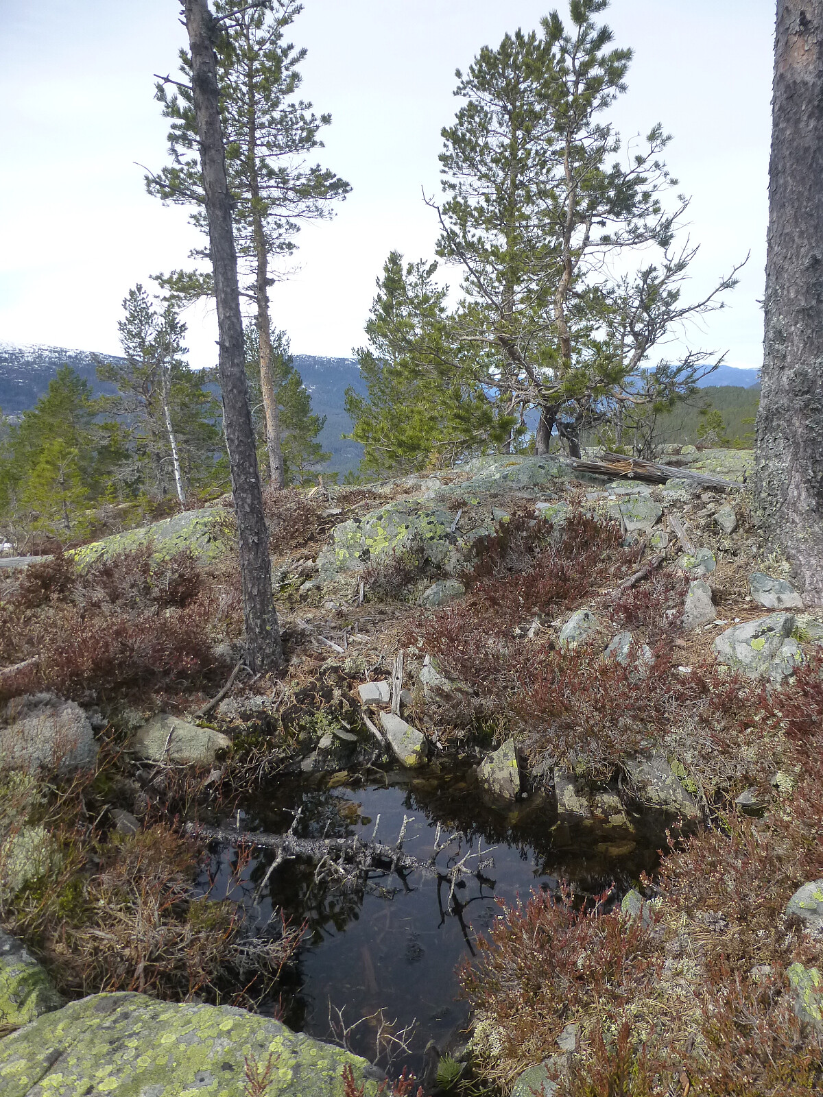 Så var det bare å nyte turen opp lia i glissen furuskog. Et fint toppunkt med utsikt mellom trea. Blefjell, Venåsfjell, Lifjell var helt hvite nå. Det ble en liten pause og så tuslet jeg ned igjen samme veg til myra.