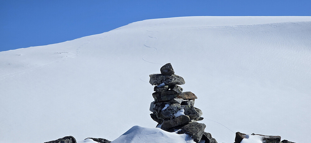 Et godt lag med nysnø er kommet høyt oppe i fjellet, solen skinte fra skyfri himmel og nesten vindstille på alle topper! Et kort stykke med GPS-glipp mellom Spiterhøe og Skauthøe..