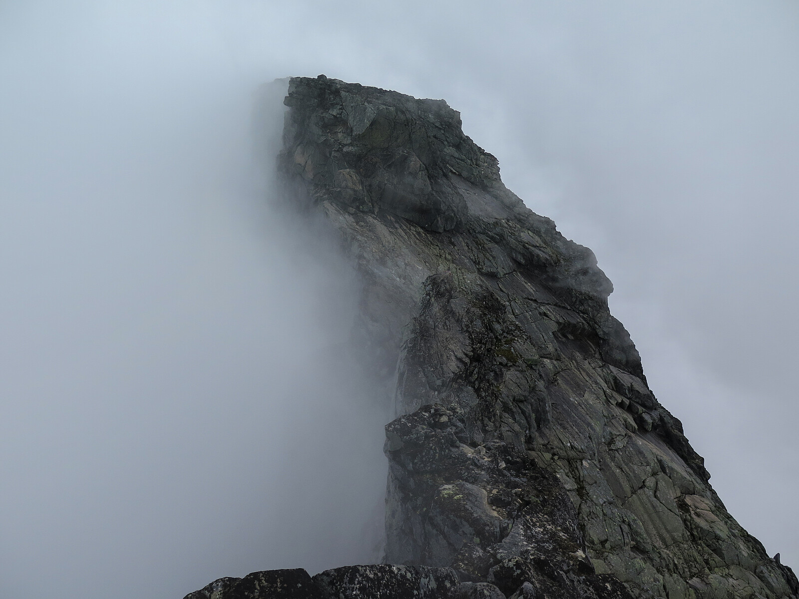 Da Sigrid var kommet opp hørte vi stemmer borte ved S2. Tre menn kom plutselig ut av tåkehavet og jeg skyntet meg å rigge istand rapellfeste for å unnga trafikkork. Jeg ropte ned til de tre mennene at vi var nybegynnere slik at de skulle forstå om ting kunne ta litt lang tid. På nordsiden av Pinakkelen er det rundt 15 meter ned i skaret til Søre. Veggen går lodrett og rapell er nødvendig for å ta seg ned her. Jeg målte og kuttet opp en slice med 7mm tau til rapellfestet og hang den rundt steinen med resten av bunten med gamle fester. Jeg tredde så tauet vårt gjennom de fleste andre festene også. Greit å gjøre når man har mulighet. Jeg hjalp Sigrid med å få alt klart for henne til å rapellere. Sigrid ble plutselig veldig usikker og det tok tid før hun klarte å gå i seg selv og lene seg bakover. Jeg var tålmodig. Jeg skjønte henne godt. Det var jo tross alt første gang vi gjorde dette i praksis på egenhånd. I mens snakket jeg med de tre karene som nå kom opp en etter en. Det ble trangt om plassen på dette «tynne» spiret. En av dem var tindevegleder i Norgesguiden og de to andre var klienter.