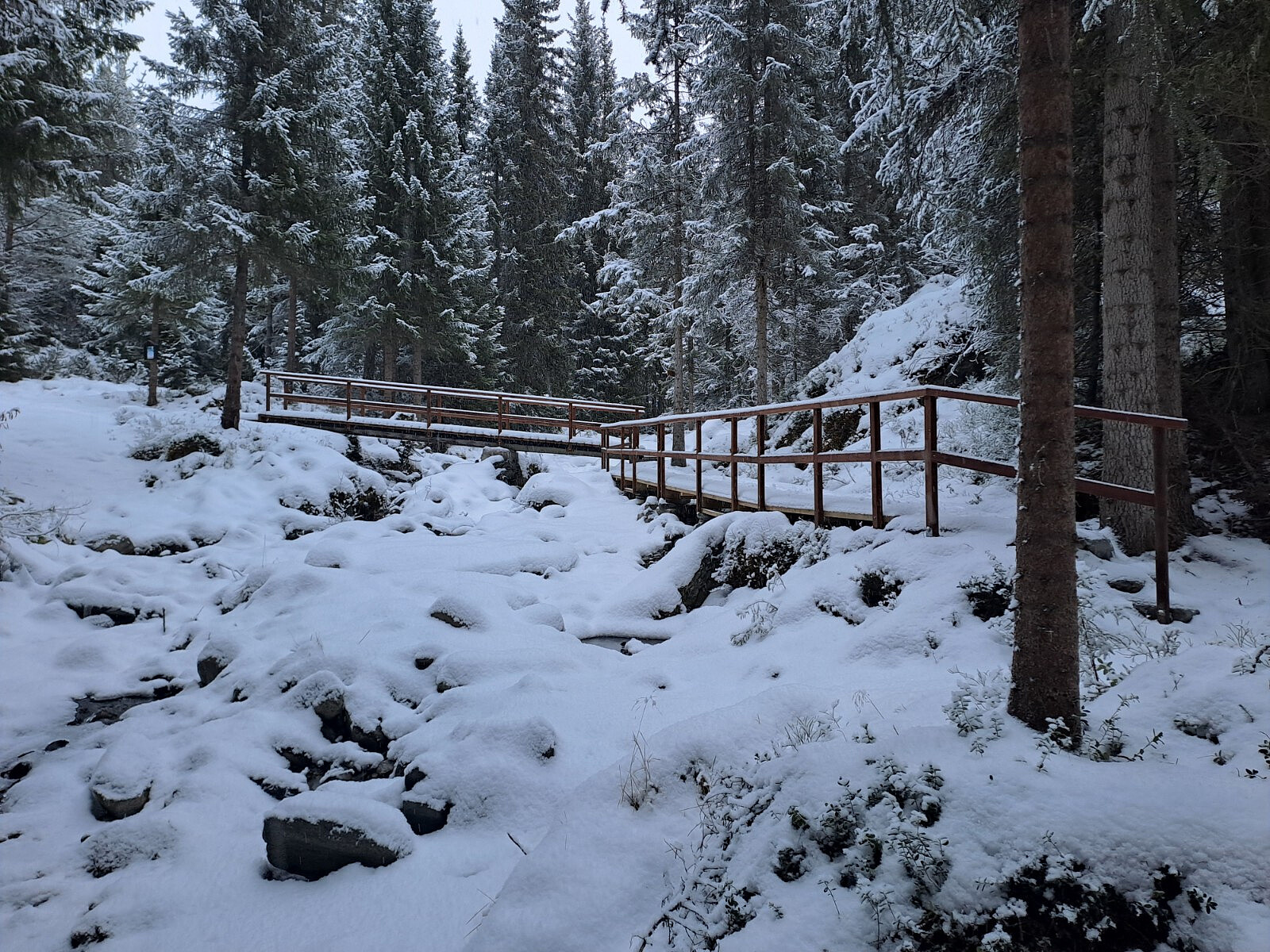 Ba med meg Vidar på en tur til Nysætra/Tronsvangen. Gikk ned til Digrebrua, derfra opp til Nysætra og videre til Tronsvangen. Det hadde kommet et lite snølag i løpet av natta.