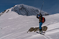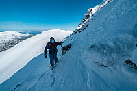 Endelig en dag med skikkelig sol! Først gikk vi opp til Gjerdhøa på tungt kladdeføre. Bløt snø nederst og tørrsnø i høyden. På toppen tørket vi skifellene før nedkjøringen til Svorundtjønna. Videre opp den markerte sørryggen til Svorundfjelet. Underveis var det ekstrem vind og skumle vindkast. Fortsatte ned i skaret før oppgangen til Roksdalskammen. Litt roligere her, men langt fra vindstille Fin nedkjøring til Nyhussætra og trått sugeføre videre til bilen. Takk for turen Øyvind. Bilder